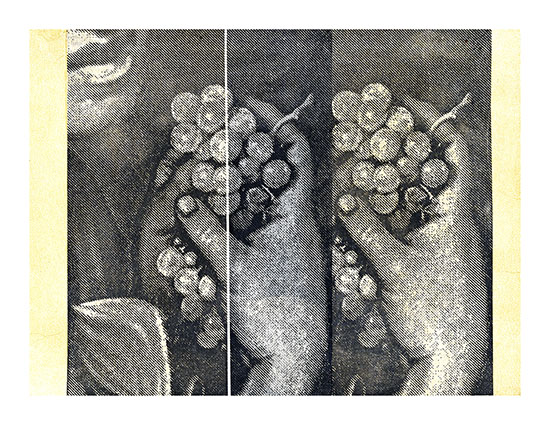 18J’utilise ce mode de composition dans une série où je m’approprie l’histoire de la nature morte. En m’inspirant du fait qu’on répète quand on veut souligner certains mots (par exemple, la répétition de très dans il est très, très, très sympa !), je juxtapose par collage plusieurs épreuves portant le détail qui condense – à mes yeux – la charge sensuelle ou signifiante du tableau18. Au contraire de la répétition avec accident qui fait disparaitre le référent de l’image, la répétition, ici à l’identique, cherche à souligner et capter sa présence prégnante.