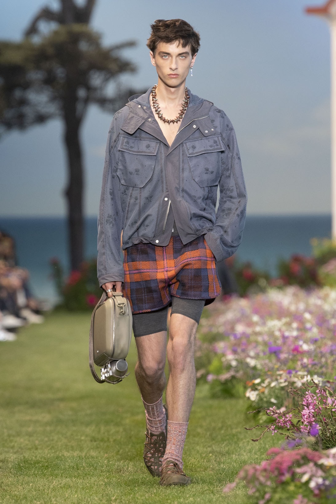 33Such ambivalence also characterises Jones’s spring/summer 2023 collection for Dior Men (Charleston Trust 2022). Once again, Jones reinvents the catwalk by designing a set (Dior 2023a)43 which, in itself, creates a narrative, as it features two stylised scaled-down houses connected by an equally stylised long garden in bloom. The male models emerge from the first house, which symbolises Christian Dior’s home in Normandy (Dior 2023b),44 and walk across the garden with its myriad of real flowers. Meanwhile, this turns into a metaphorical journey across the Channel, as the second house stands for Charleston Farmhouse (Dior 2023c),45 Bell and Grant’s home in Sussex. As befits a walk through green, flowery scenery, the collection is coded as outdoorsy, complete with fabrics that may include the latest techwear (Dior 2023d)46 and Gorpcore elements (Dior 2023e),47 hiking shoes (Dior 2023f),48 big zips, camo-jackets (Dior 2023g),49 large pockets (Dior 2023h),50 and sun hats (Dior 2023i)51 (an occasional nod to the straw gardening hats worn by Grant when painting outside [Morrel 1922]).